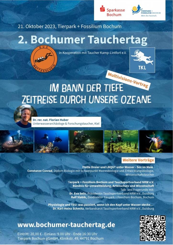 Am 21. & 22. Oktober findet der 2. Bochumer Tauchertag im Tierpark + Fossilium Bochum statt! Taucht mit uns ab in die Meeresbiologie, die Tauchmedizin, den Tierpark + Fossilium Bochum und in die Tiefe der Unterwasserarchäologie...
