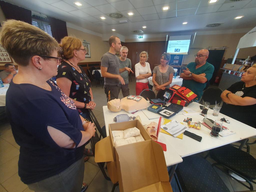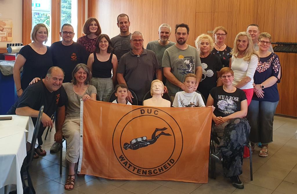 Am 10.06.2023 hat der DUC Wattenscheid einen Herz-Lungen-Wiederbelebungskurs angeboten, den ich gerne wahrgenommen habe. Neben Thomas Jechow wurden wir noch von Gido Au und Patrick Harenberg durch den Kurs geführt. Zunächst gab es eine kleine Einführung und kurze Rede von Thomas. Danach wurden wir in zwei Teams aufgeteilt und haben eine Herz-Lungen-Wiederbelebung an zwei Dummies durchgeführt. In meinem Team war Patrick unser Leiter. Als Arzt konnte er nochmal ganz anders auf Fragen eingehen und Tipps aus der Praxis geben. Zunächst wurde eine Wiederbelebung mit einem Defibrillator gezeigt. Patrick ging währenddessen schon auf unsere Fragen ein und hat jeden Schritt mit dem Defibrillator gut und verständlich erklärt. Danach wurde an unserem Dummie ein Tauchunfall simuliert. Es kostet natürlich Fantasie und auch ein bisschen Überwindung den Dummie nicht einfach nur als Puppe anzusehen, sondern in dem Augenblick als einen echten Tauchverunglückten. Ich musste den Verunglückten ansprechen, ihm kurz Schmerzen zufügen (z.B. mit dem Faustrücken kräftig über die Brust reiben), um wirklich sicherzugehen, dass er bewusstlos ist und dann ohne Verzögerung mit der Herz-Lungen-Wiederbelebung starten. Und nein, es ist nicht so einfach wie es im Fernsehen immer dargestellt wird. Nach drei Durchgängen war ich schon am Ende meiner Kräfte; ich habe das wirklich unterschätzt.