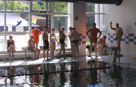 werden. Und so war es nur konsequent, dass der DUC selbst zum Veranstaltungsort im Rahmen der Sportabzeichen Aktionswoche wurde. So steht immer der Samstag allen Bochumer Bürgerinnen und Bürgern für die Abnahmen der Schwimmdisziplinen in unserem Trainingszentrum in Westenfeld offen. Auch Sportler, die nur ihre Schwimmfähigkeit unter Beweis stellen wollen, sind stets willkommen. Das Angebot wird von Jahr zu Jahr beliebter, wie die wachsenden Teilnehmerzahlen belegen. Gerade älteren Bürgern fällt es im Wasser oftmals leichter, die geforderten Strecken und Zeiten zu meistern. Und so gibt es bereits zahlreiche „Wiederholungstäter“, auf die sich die Clubmitglieder jährlich freuen.
